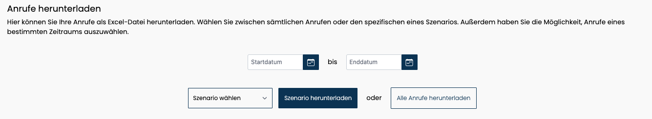 Sie können unter dem Reiter Datenschutz im Bereich "Einstellungen" entweder alle Anrufe, die Anrufe eines bestimmten Szenarios oder eines bestimmten Zeitraums herunterladen.