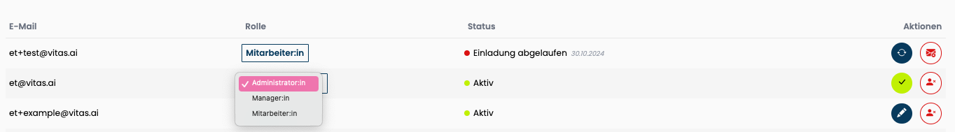 Sollte es erforderlich sein, haben Sie über die Aktionsbuttons auf der rechten Seite die Möglichkeit, die Einladung erneut zu versenden oder zurückzuziehen.